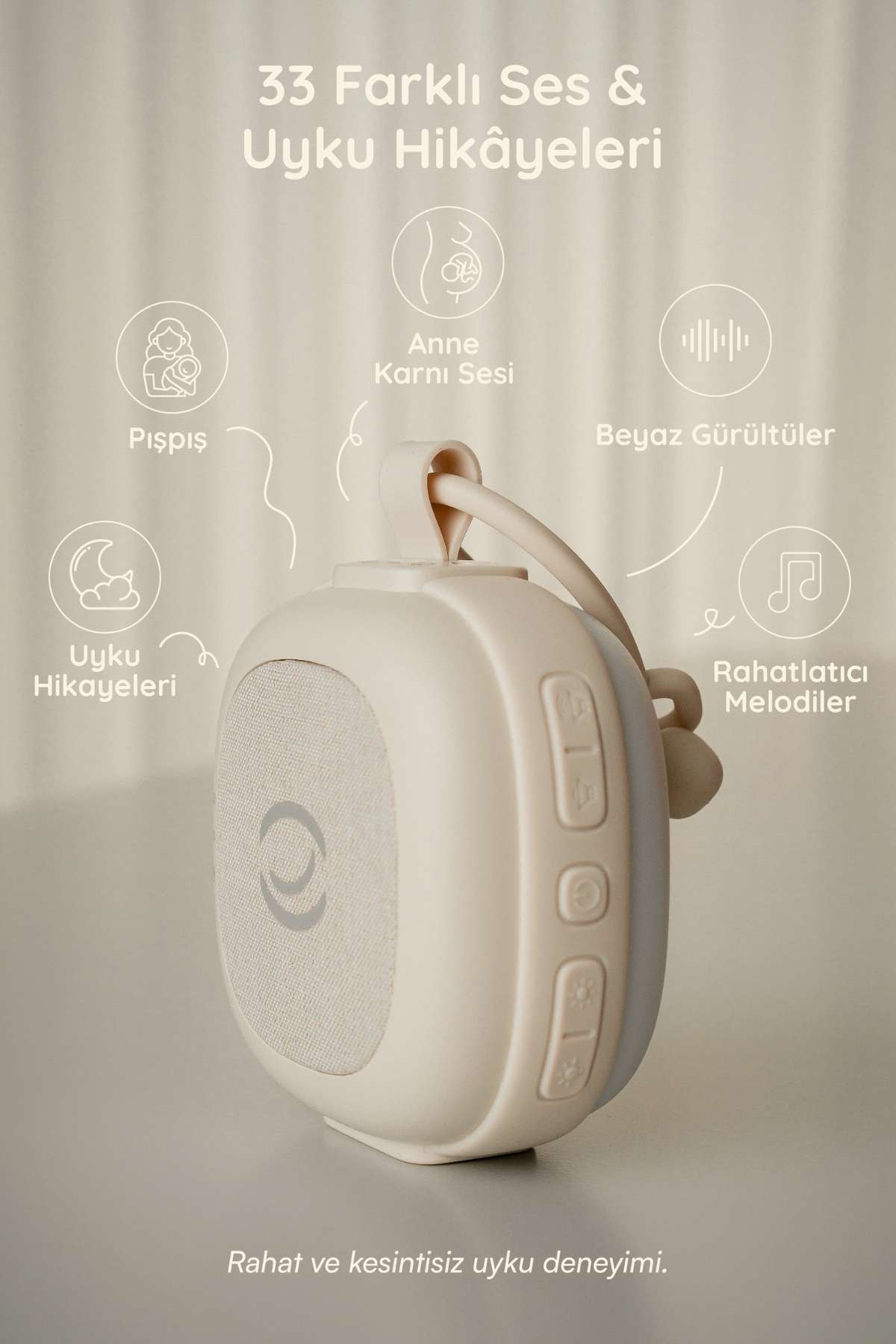 Ağlama sensörü, ses kayıt özelliği, uyku hikâyeleri ve 33 farklı ses seçeneğiyle standart cihazlardan ayrılır.