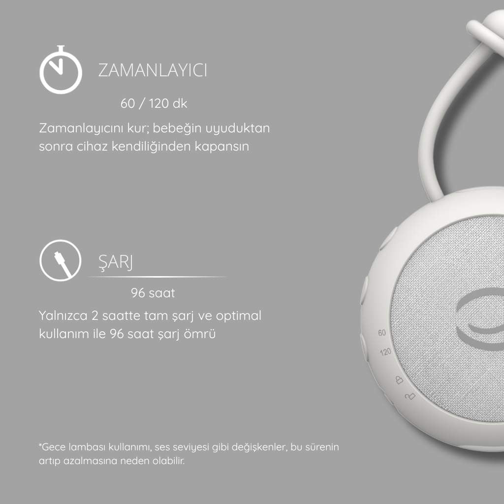 Maskeleme özelliği, cihazın içinde bulunan beyaz gürültü seslerine ait bir özelliktir ve dış seslerin bloke edilmesini/maskelenmesini ifade eder. Böylece bebeklerin uykusu kardeş gürültüsü, kapı çarpması gibi dış sesler nedeniyle bölünmez.