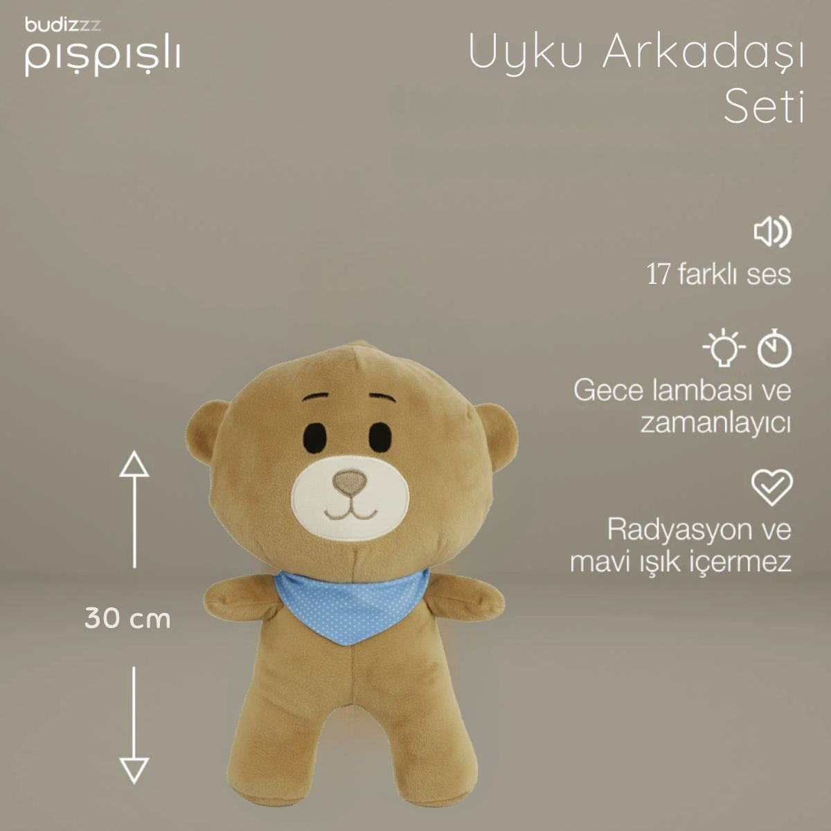 Yenidoğan bebeklerin güvenli kullanımı için Budizzz ayıcığının boyutu 25 cm olarak belirlenmiştir.