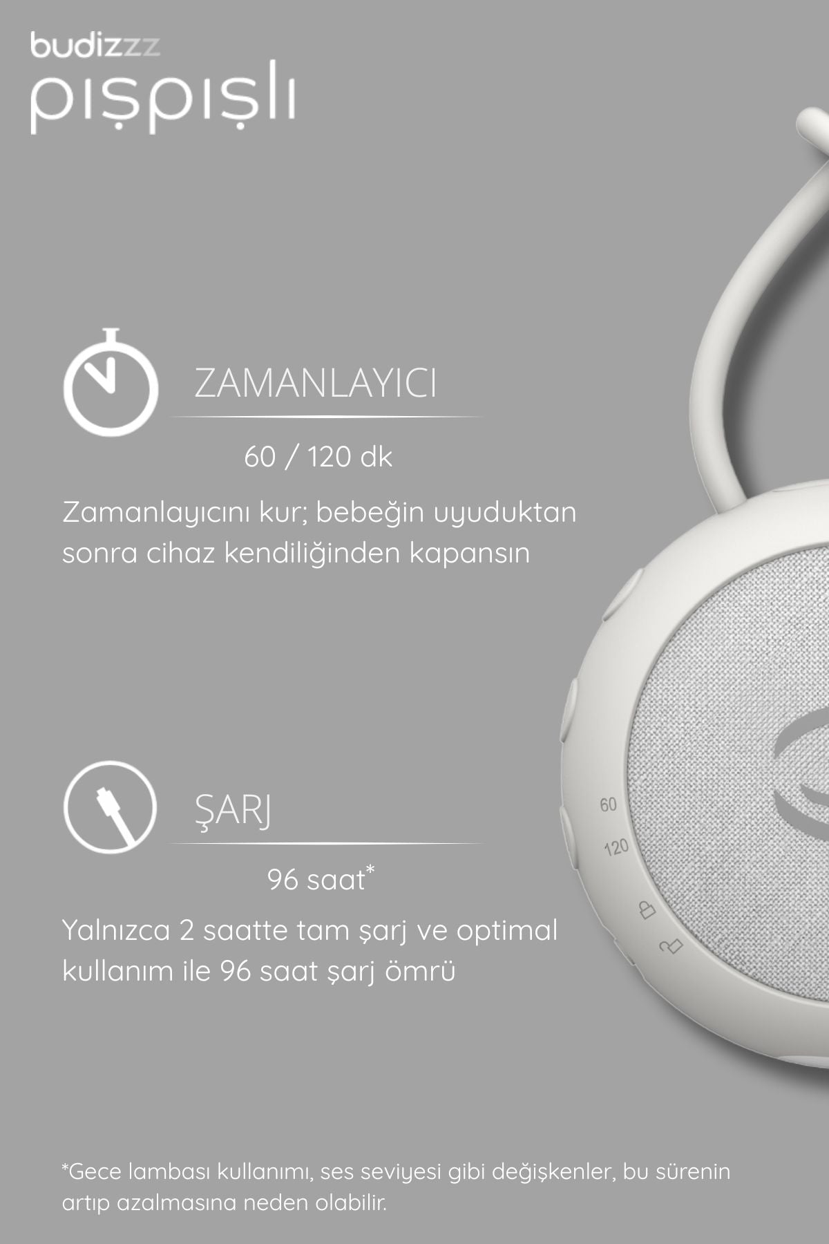 Budizzz Beyaz Gürültü Cihazı optimal kullanımla ortalama 4 gün -90 saat- boyunca aralıksız kullanılabilir; ancak, kullanım alışkanlıklarına göre bu değer değişebilir.
